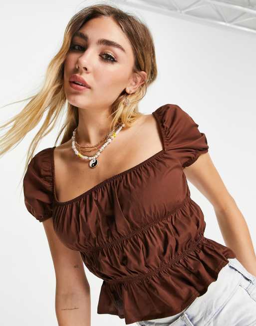 Shirred clearance smock top, Bershka shirred smock top with frill hem in brown clearance