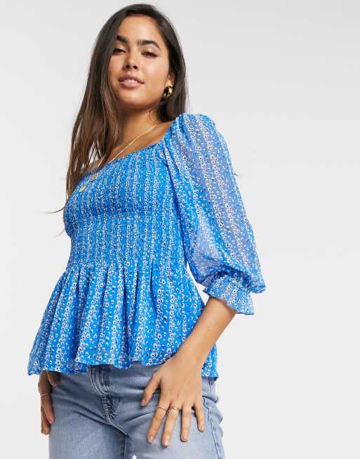Y.A.S shirred smock top with square neck in blue ditsy floral