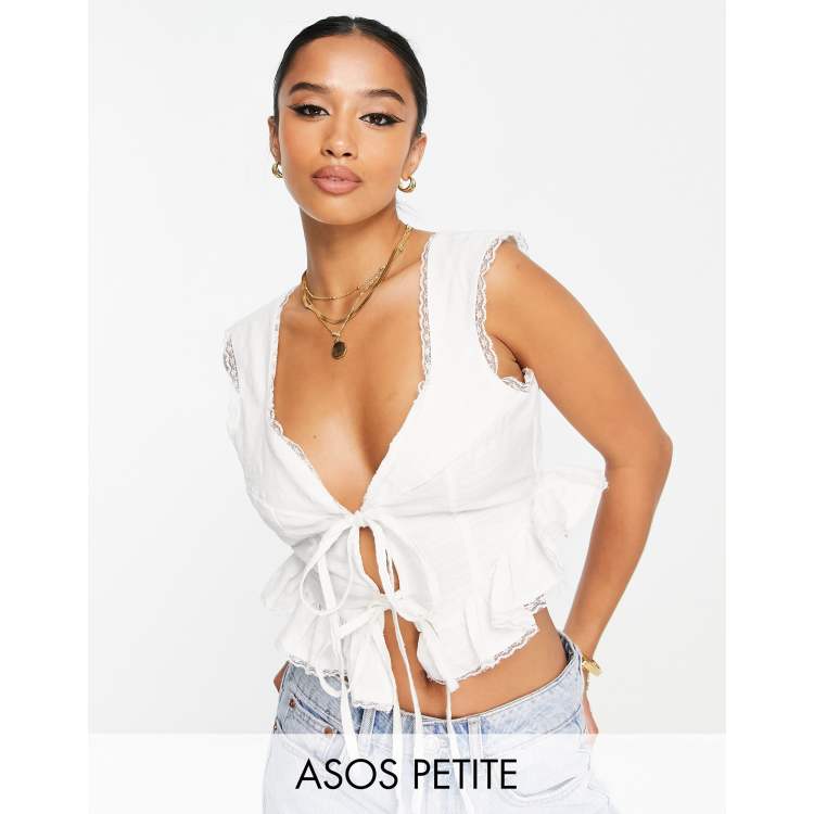 ASOS DESIGN Petite lace trim tie front corset detail top in white