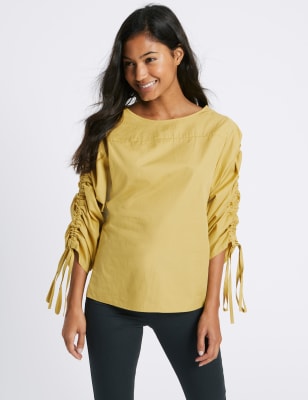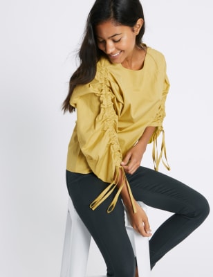 Pure Cotton Slash Neck Ruched Sleeve Blouse M S Collection M S