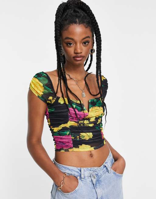 ASOS DESIGN ruched mesh crop top with v bar in floral