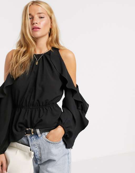 ASOS DESIGN cold shoulder top with ruffle in black