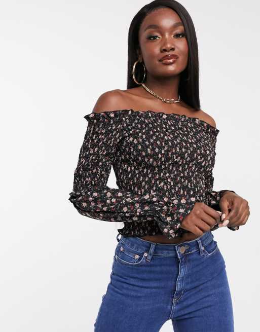 Missguided shirred bardot top with long sleeves in ditsy floral print