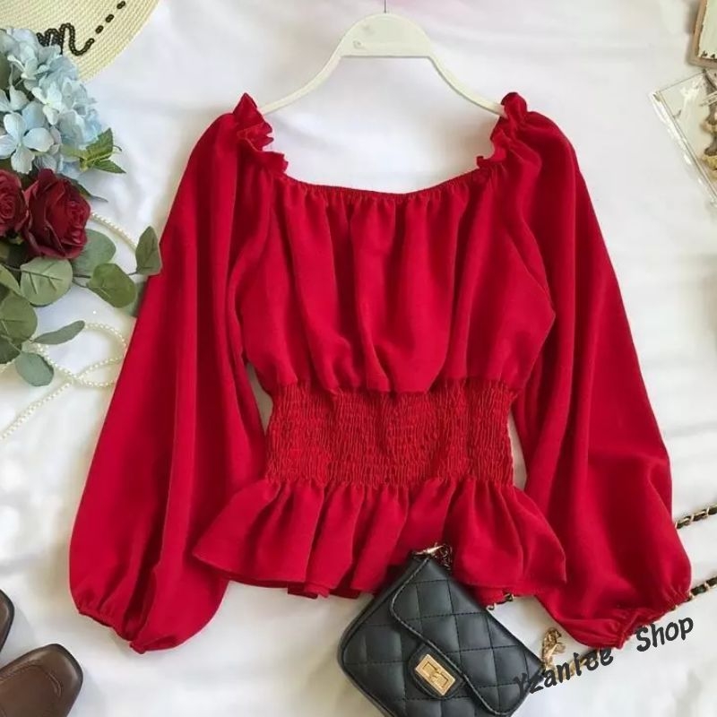 Chiffon Long Sleeve off Shoulder Tops Korean Style Waist Tight