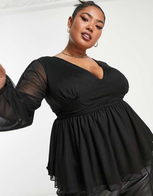 ASOS DESIGN Curve exclusive mesh flared sleeve plunge peplum top in black