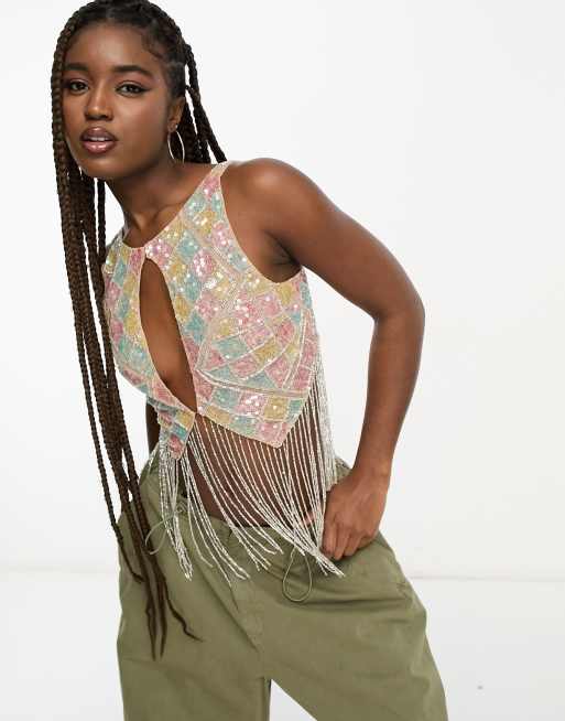 ASOS DESIGN patchwork embellished crop top with fringe hem in
