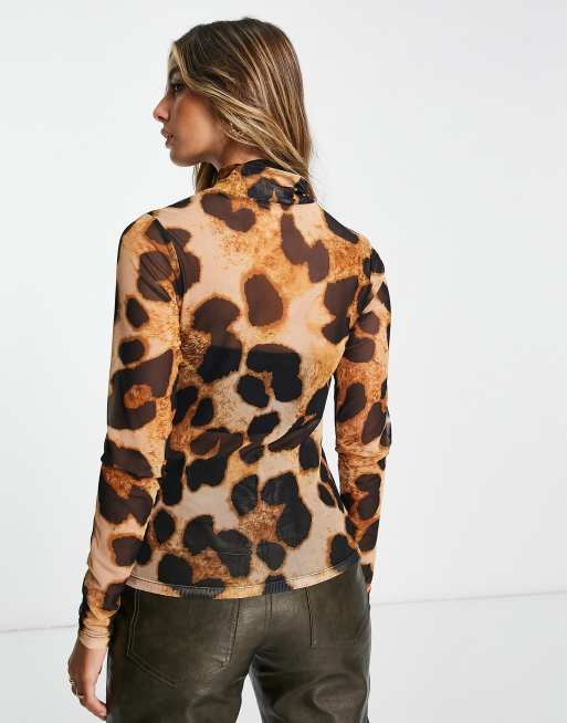 ASOS DESIGN mesh high neck long sleeve top in leopard print