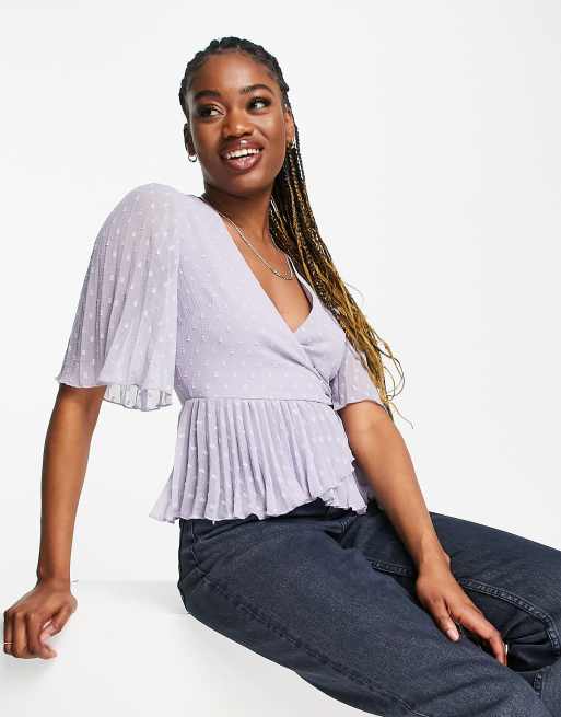 ASOS DESIGN textured wrap short sleeve blouse with pleated peplum hem in light blue