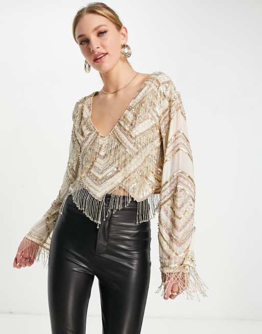 Asos clearance gold top, ASOS DESIGN embellished long sleeve top with fringe detail in gold clearance