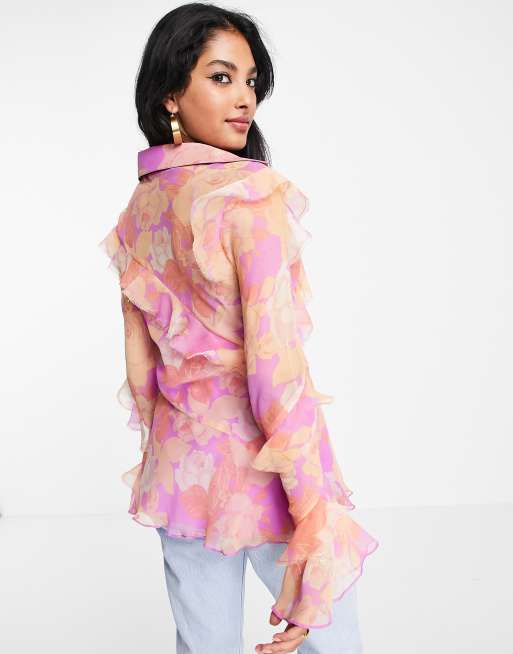 ASOS DESIGN v neck ruffle blouse with frill detail and button edge in pink pastel floral print
