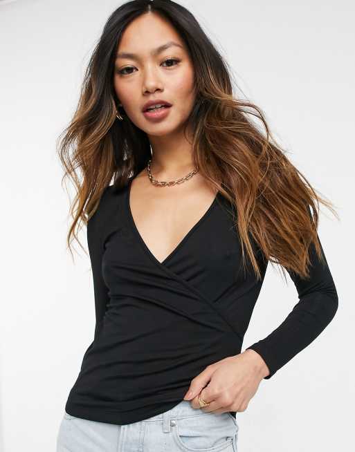 Asos black wrap clearance top, ASOS DESIGN long sleeve sheer wrap top in black clearance