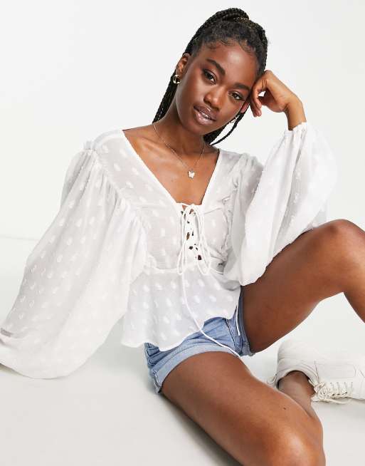 ASOS DESIGN textured long sleeve blouse with lace up front