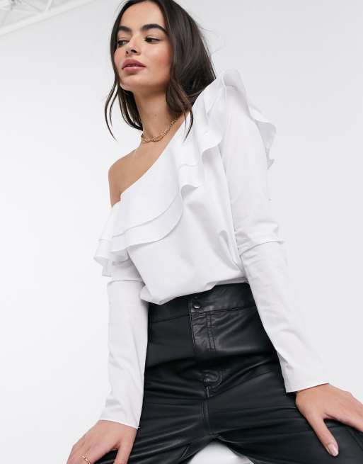 White frill one clearance shoulder top, Bonnie White One Shoulder Flower Trim Bodysuit Miss G Couture clearance