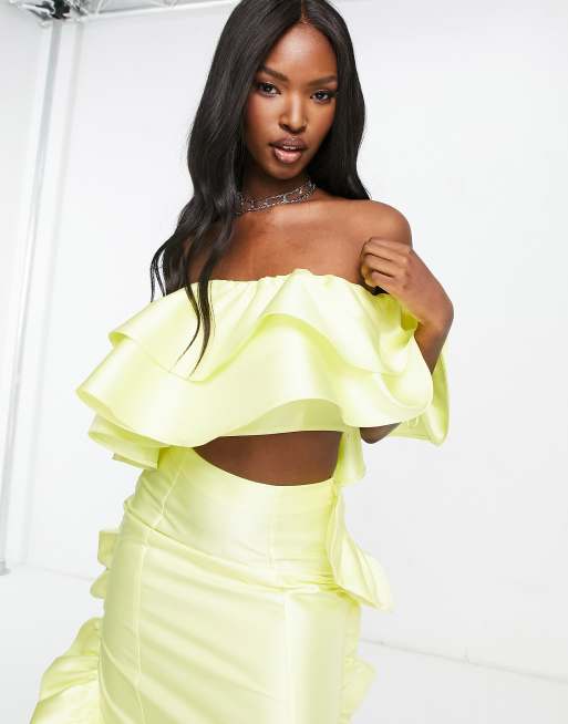 ASOS LUXE satin ruffle off shoulder crop top in lemon part of a set