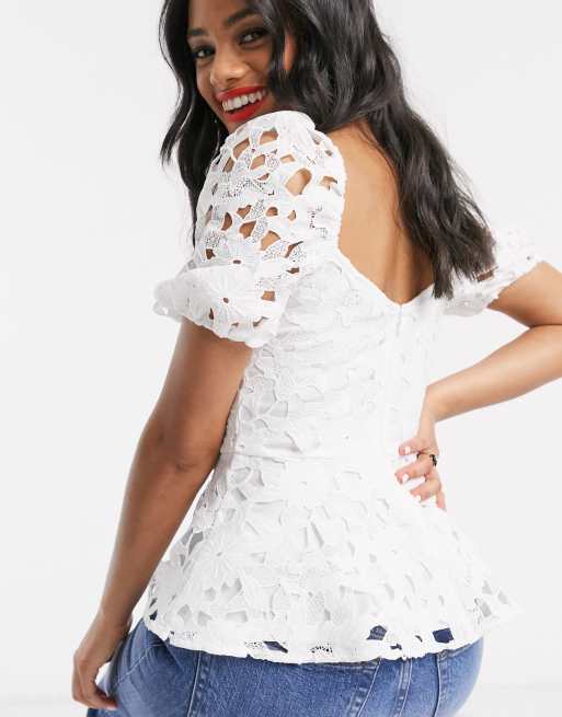 Lipsy lace puff sleeve peplum top with sweetheart neckline in white