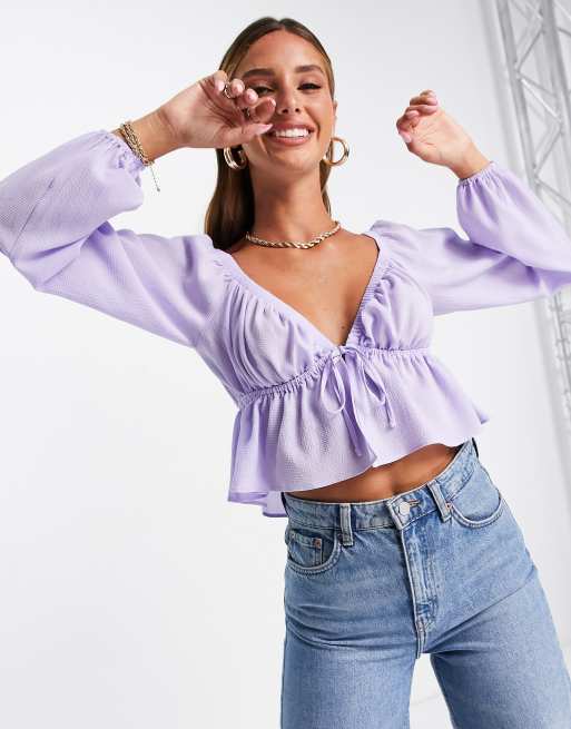 ASOS DESIGN tie front peplum top with long sleeve and gathered shoulder detail in lilac