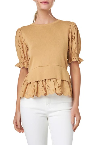 English Factory Mixed Media Eyelet Puff Sleeve Peplum Top In Tan