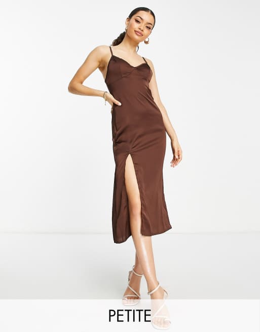 Parisian Petite satin slip dress with split in chocolate brown ASOS