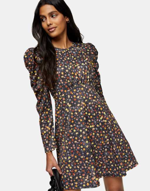 Topshop ruched channelled poplin flippy mini dress in black