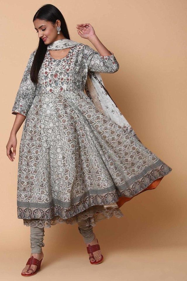 Printed Cotton Round Neck Womens Churidar Kurta Dupatta Set