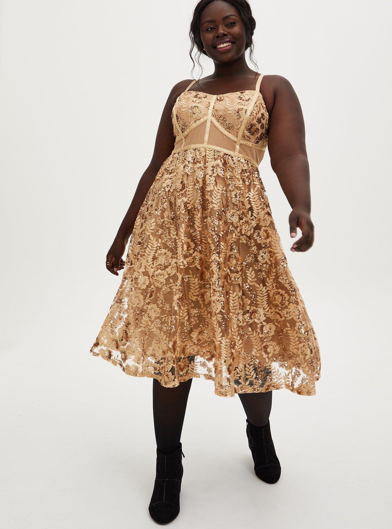 Plus Size Gold Mesh Embroidery Sequin Midi Dress Torrid