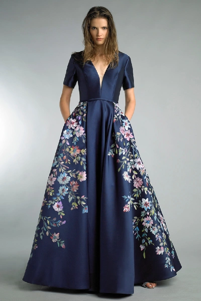 Basix Black Label Short Sleeve Navy Blue Hand Painted Floral Ball Gown ModeSens