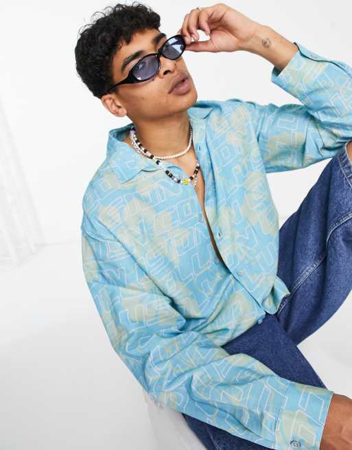 Asos clearance festival look, COLLUSION festival linen look branded long sleeve hibiscus summer shirt in blue clearance