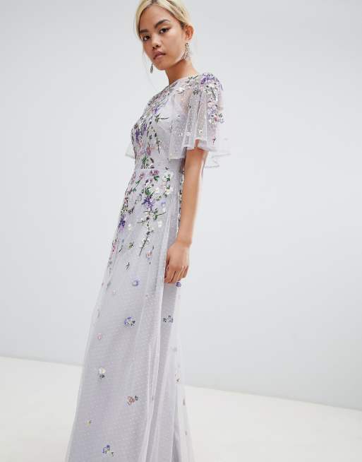 Asos design floral clearance embroidered dobby mesh, ASOS DESIGN Petite floral embroidered dobby mesh flutter sleeve maxi dress clearance