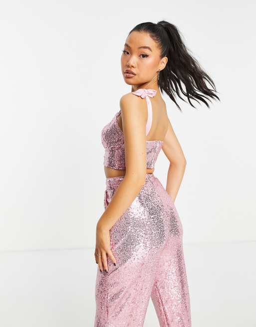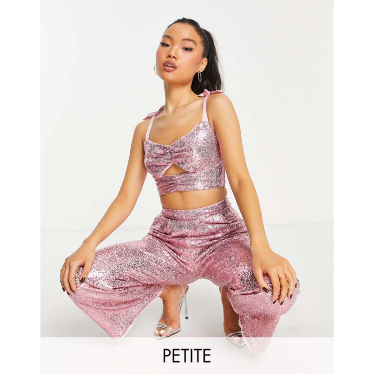 Jaded Rose Petite exclusive sequin cut out crop top in baby pink part of a set