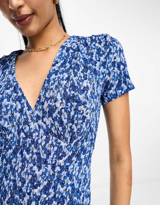 Mango cinched waist dusty floral short sleeve mini dress in blue