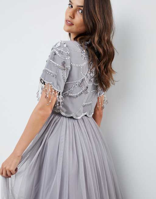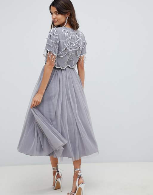 Asos design crop top clearance fringe embellishment tulle midi dress, ASOS DESIGN midi dress with embellished crop top and mesh skirt clearance