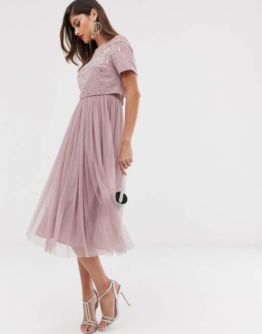 ASOS DESIGN midi dress with embellished crop top and mesh skirt