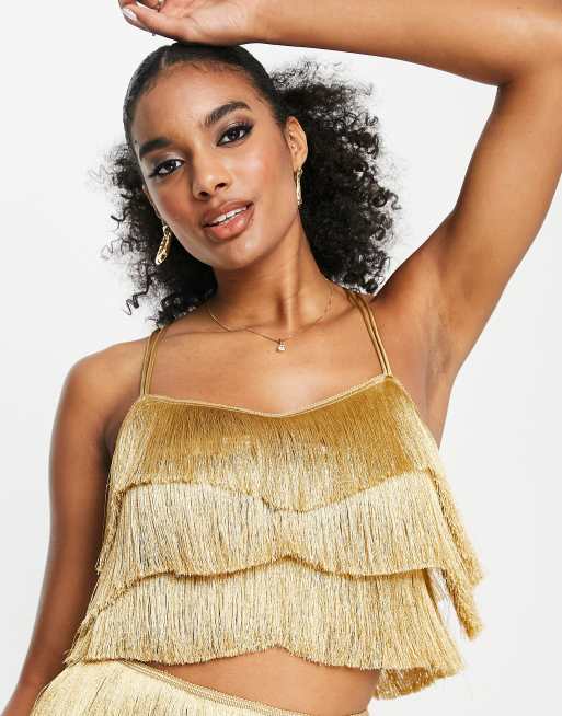 ASOS DESIGN strappy crop top fringe layered detail in gold part of a set