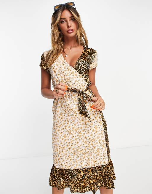 Vila midi wrap dress in mixed floral and leopard print