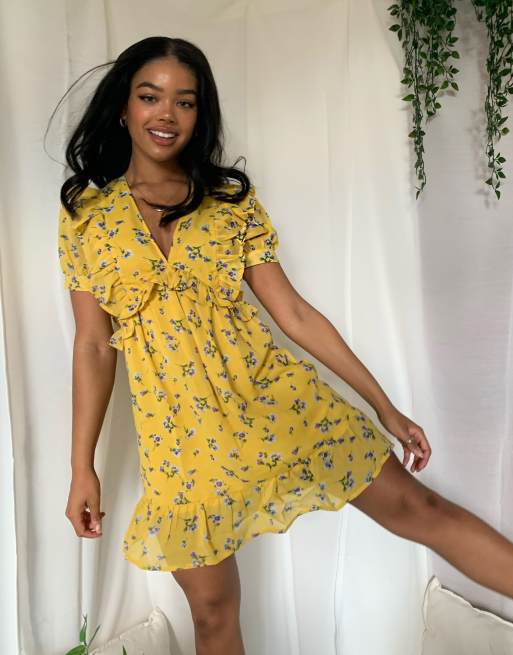 Yellow floral skater clearance dress, Yellow Floral Bardot Frill Skater Dress PrettyLittleThing clearance