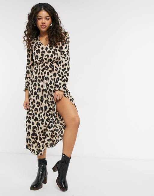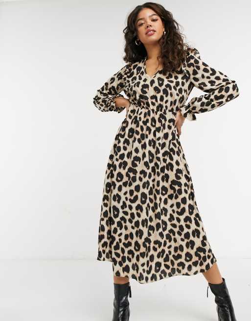 Pieces midi dress with frill shoulder in leopard print ASOS