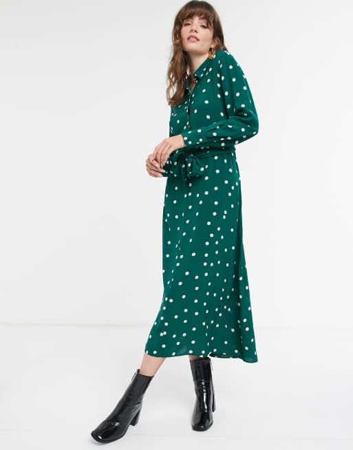 Other Stories polka dot tie front midi shirt dress in dark green