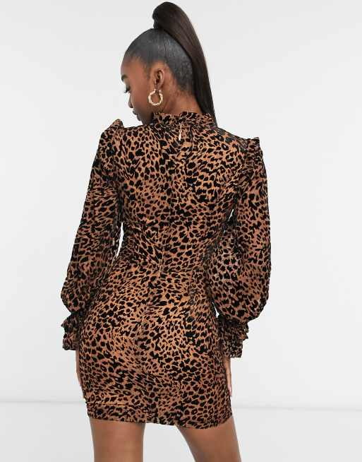 Lavish Alice velvet devore high neck cut out micro ruffle mini dress in leopard print