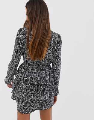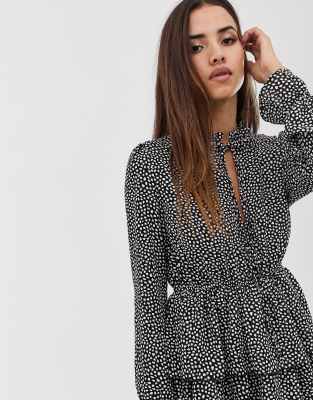 Boohoo tiered ruffle mini dress with clearance keyhole tie detail in mono polka dot