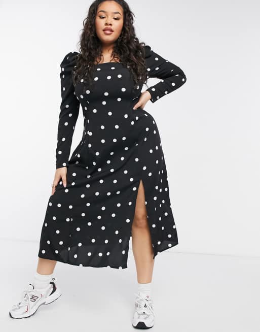 Polka dot slit clearance dress, Simply Be square neck midi dress with side slit in black polka dot clearance