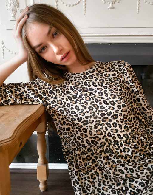 Stradivarius shirt dress with shoulder frills in beige animal print