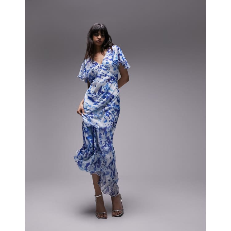 Topshop printed occasion v neck flutter sleeve maxi dress in blue