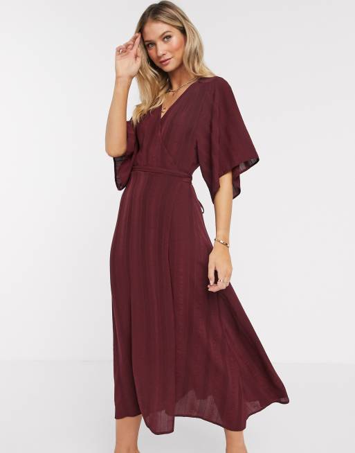 Liquorish kimono sleeve wrap midi dress in burgundy