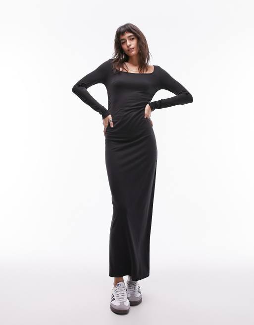 Topshop long sleeve satin and jersey maxi dress in black ASOS