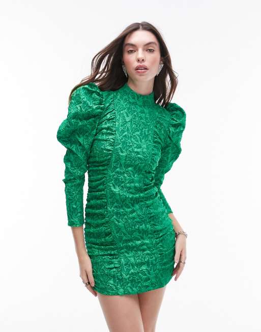 Topshop jacquard sleeve detail mini dress in green ASOS