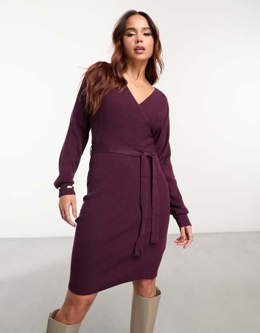 Vero Moda wrap belted long sleeve knitted mini dress in burgundy