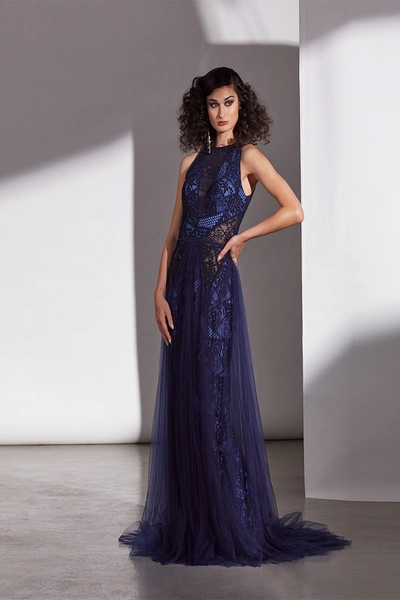 Tadashi shoji navy clearance blue lace gown