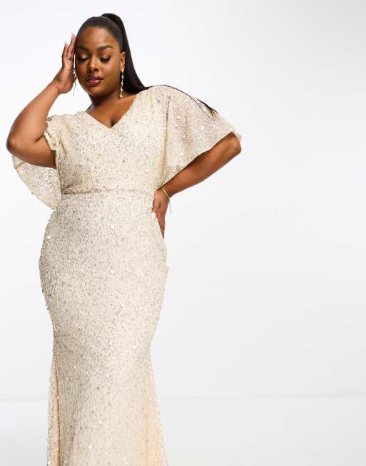 Beauut Plus Bridesmaid embellished maxi dress with flutter sleeve in champagne