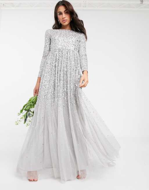 Silver long sleeve clearance maxi dress, Silver Maxi Long Sleeved Embellished Dress ELHM store clearance