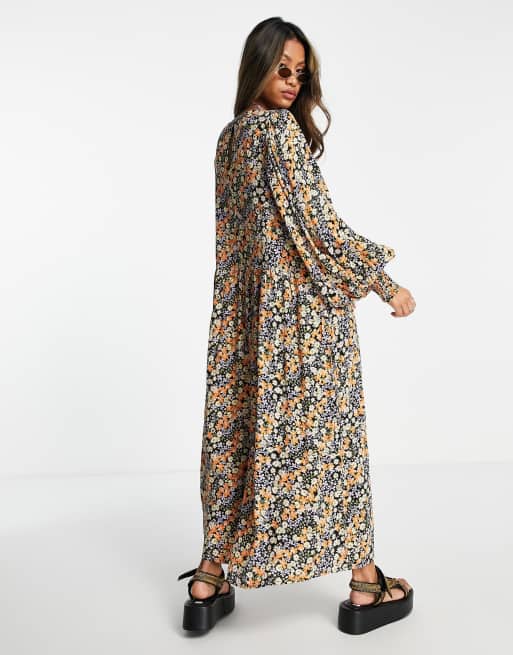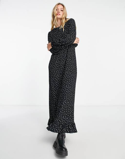 ASOS DESIGN long sleeve maxi smock dress with frills in mono spot
